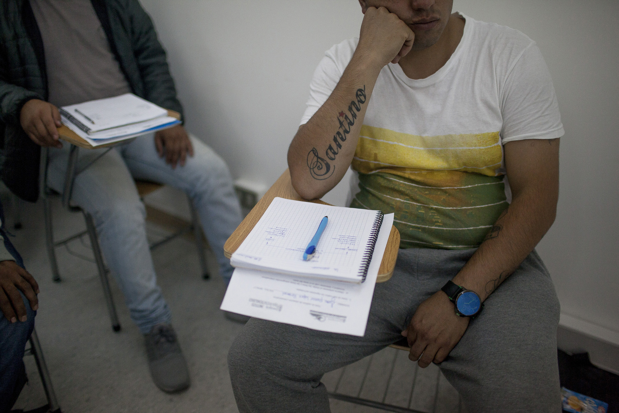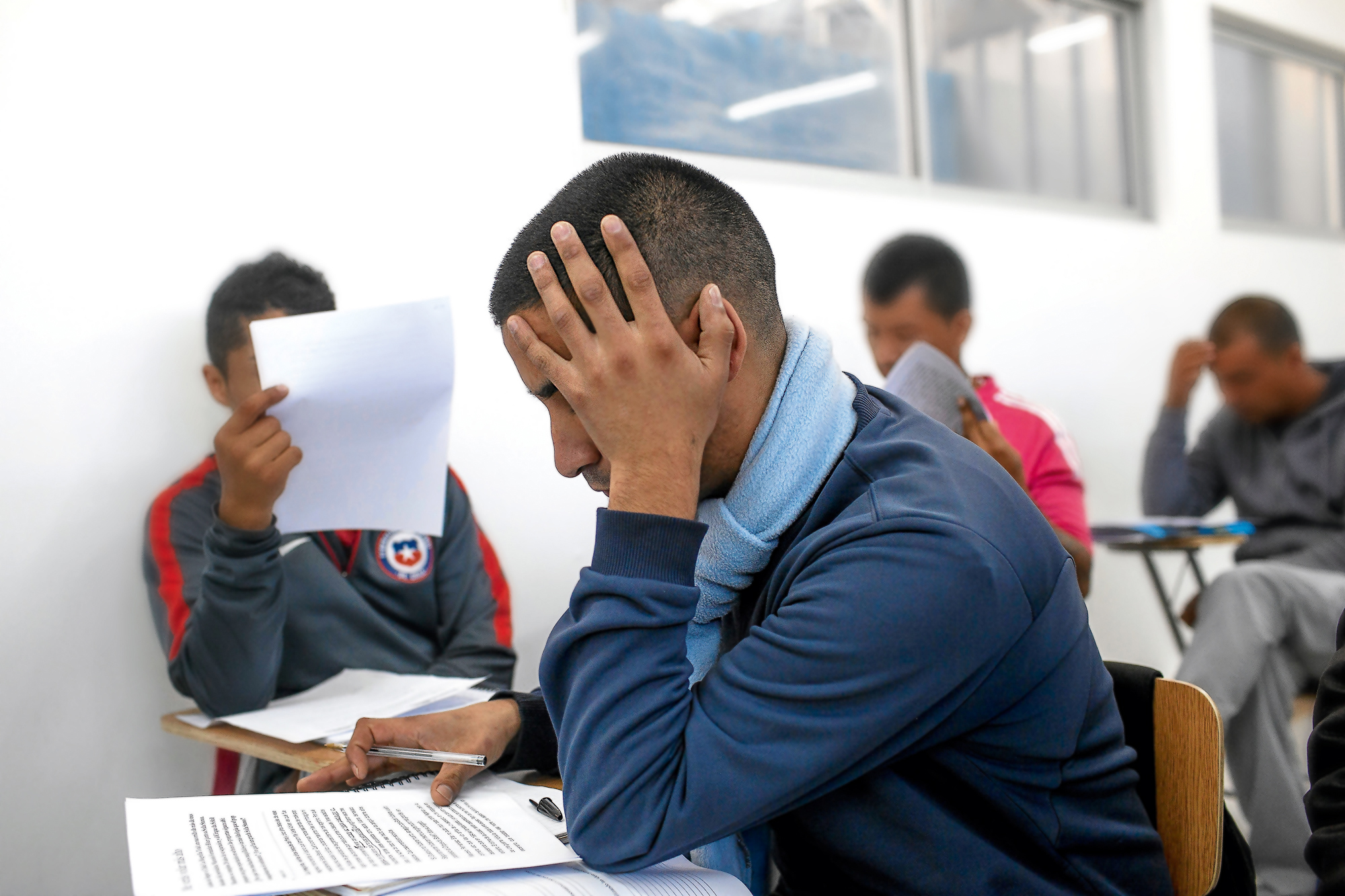 La clase de hoy trata de habilidades discursivas, y Allan, de 24 años, intenta copiar todo lo que dice el profesor en su nuevo cuaderno, luego de perder el primero en un allanamiento. Le dicen “el rapero”. Lleva un buzo de la Selección y su rostro aún tiene algo de niño, aunque su niñez terminó hace mucho. Le habría gustado ser ingeniero, pero empezó a robar a los 12, comida y ropa, y terminó asaltando casas comerciales a mano armada. Hoy vive en un módulo violento, el 105, en el que no se puede sobrevivir sin pelear: en el último tiempo han asesinado a dos internos delante de él, pero de todas formas, dice, le da susto estar aquí. Que se burlen de él, no entender.