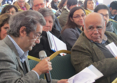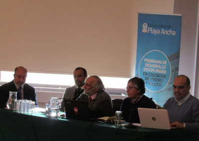 Tras la presentación anterior, y con la moderación del profesor Freddy Reinoso Montenegro (UPLA), se dio inicio a la primera mesa, la que comenzó con la ponencia llamada «Esbozo metodológico de la formación de los educadores de la EPJA”, a cargo del académico de la Universidad de La Frontera, Guillermo Williamson. Le siguió la Jefa del Programa de Nivelación de Estudios de la Universidad Católica Silva Henríquez, Judith Reyes, , con su trabajo titulado “El lugar de la comunidad en la EPJA”. Tras ella, se presentó la exposición “Interculturalidad y mediación intercultural en la formación inicial docente”, del académico de la UPLA Luis Manzo Gauquil. Como corolario, se expuso la investigación-acción que lleva adelante el CEIA Quilpué, que forma parte de los talleres de “Metodología de la Investigación Educativa» impartidos desde las SECREDUC-V a centros de educación de adultos de la región, investigación rotulada como “Una descripción del perfil del docente EPJA: la realidad del CEIA de Quilpué”, presentada por su director, Gastón Veas García.